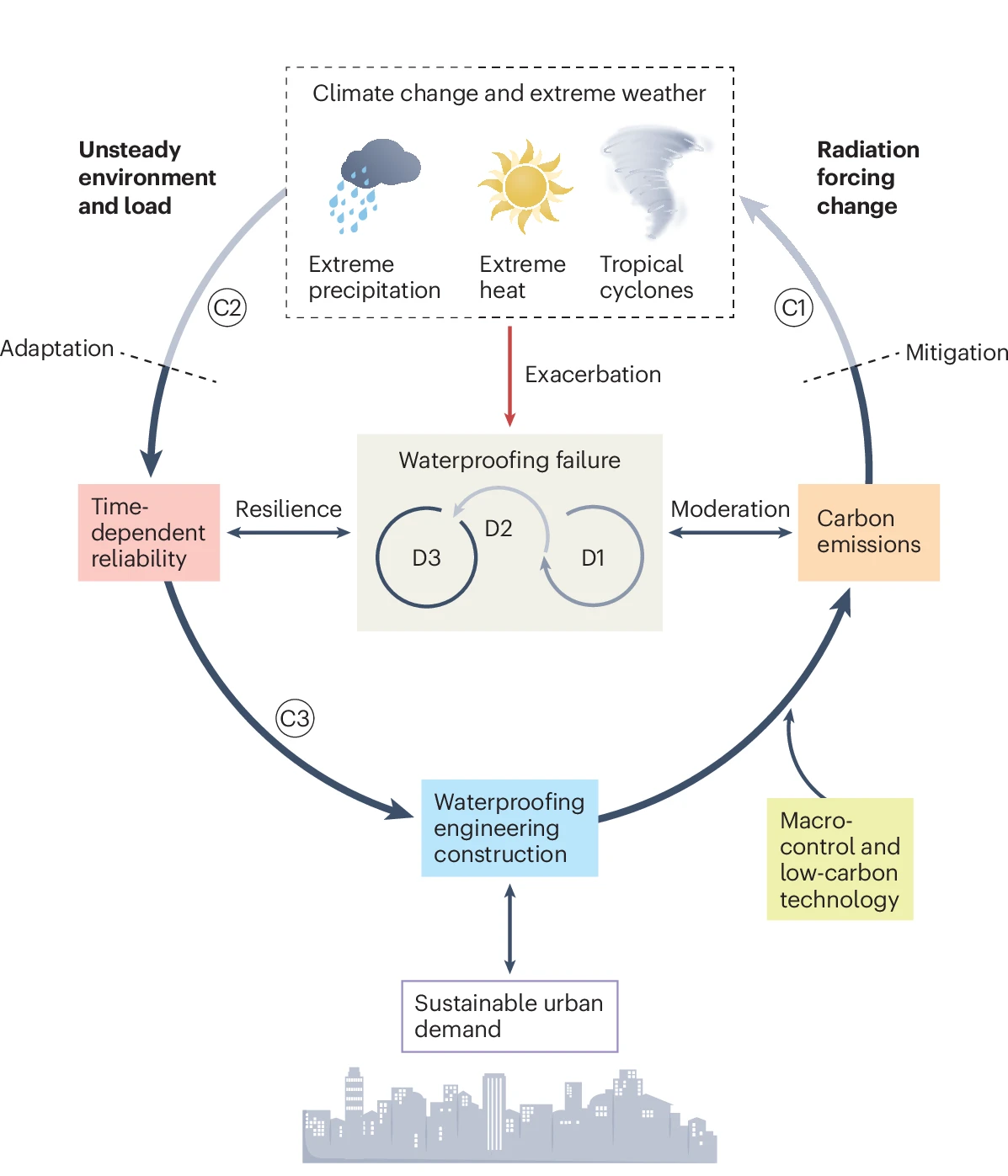 To address building water leakage challenges under climate change, the study proposes a sustainability-based waterproofing engineering philosophy (Fig. 3)