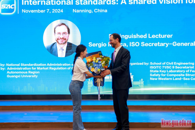 Before the unveiling ceremony, Mr. Mujica delivered a keynote speech entitled, “International Standards: A Shared Vision for a Better World” to the audience of over 200 faculty members and students from Guangxi University and other schools. He also communicated and interacted with the audience on various topics, including ways to participate in the development of ISO international standards, talent cultivation based on international standardization, and the role of standardization in reducing carbon emission.