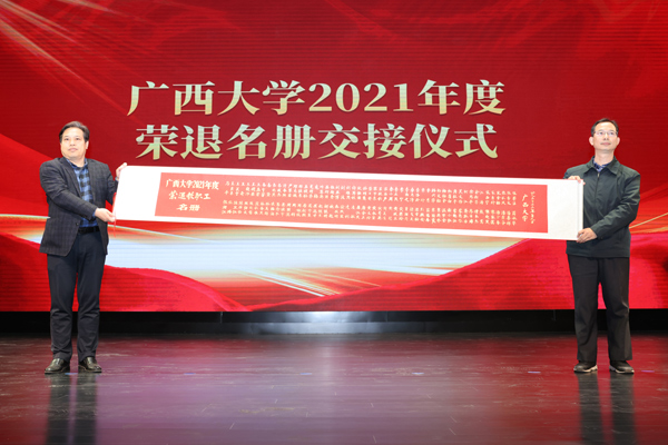 荣退仪式上,人力资源处、离退休工作处进行了565net必赢客户端2021年度荣退名册交接,精致装裱的荣退名册手写着2021年度荣退教职工名字,体现学校对退休教职工几十年兢兢业业为党工作、踏踏实实为校服务的敬重和肯定。