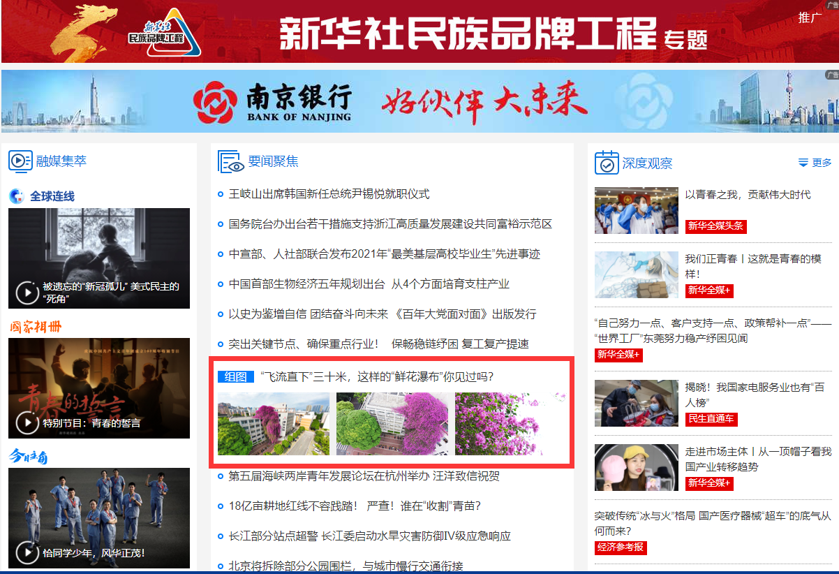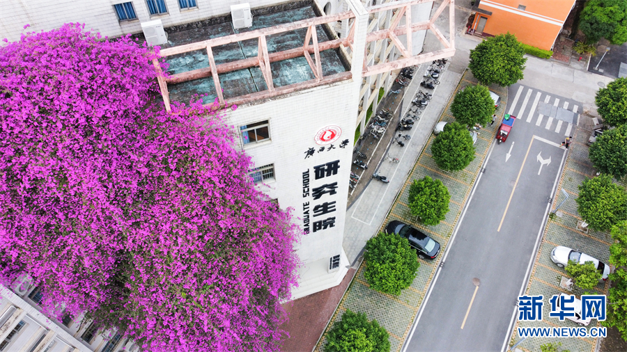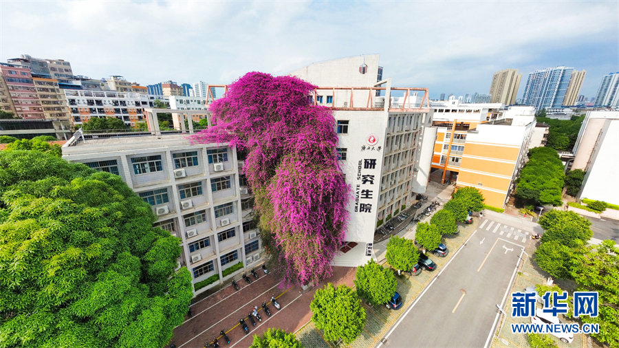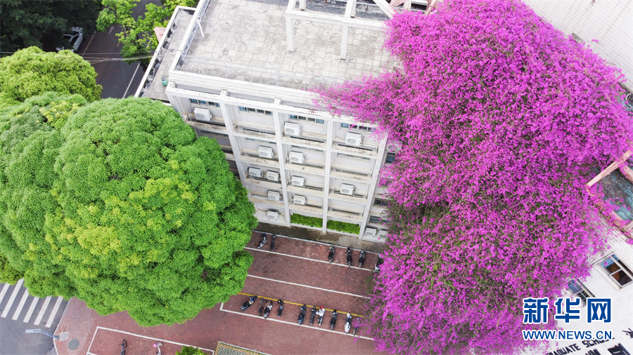 新华网南宁5月11日电(张娴君)初夏时节,在565net必赢客户端校园内,一株高近三十米的巨型三角梅正值花期。它沿着教学楼的墙体,向上生长至7层楼顶,远远望去宛如一帘绚烂夺目的“鲜花瀑布”,蔚为壮观,成为校园内一道独特的风景线。