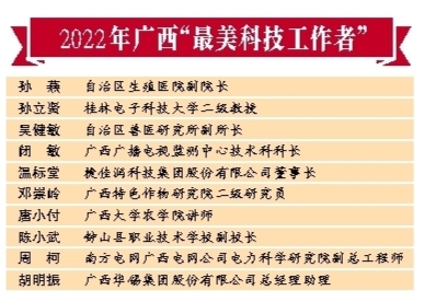 为了进一步弘扬科学家精神,激发广大科技工作者的荣誉感、自豪感、责任感,日前,自治区党委宣传部、科协、科技厅、工信厅、广西科学院、广西农科院六部门开展“最美科技工作者”选树宣传活动,并评选出10名2022年广西“最美科技工作者”。