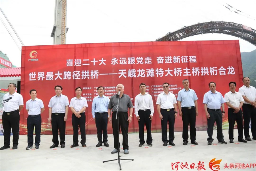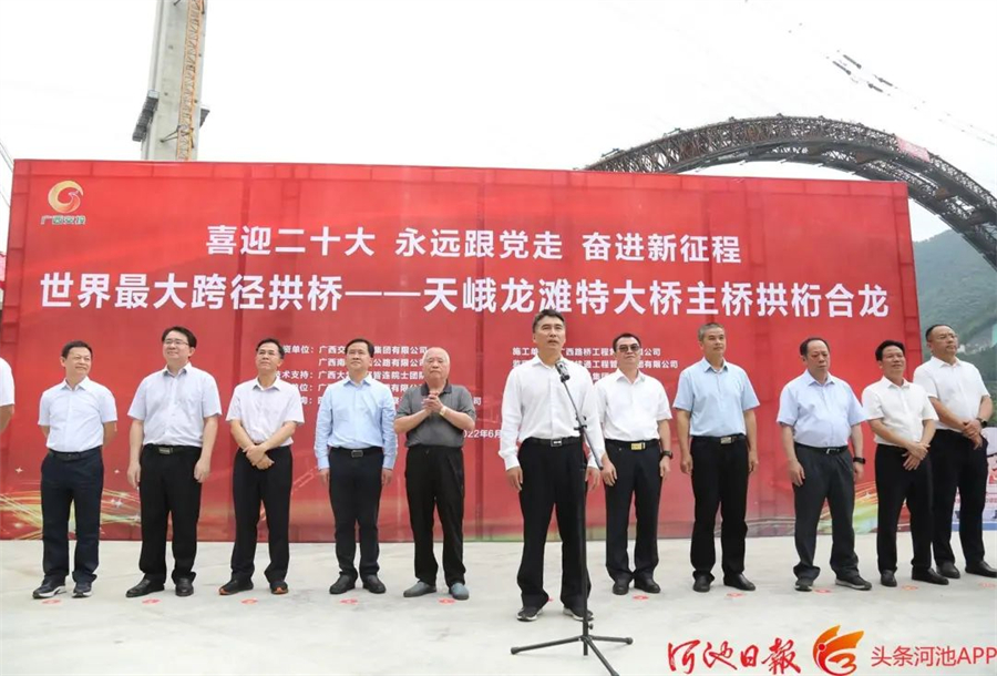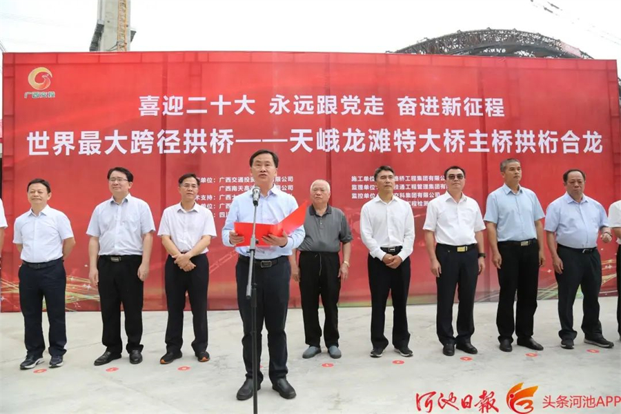 秦春成在致辞中说,南丹至天峨下老高速公路,是西部陆海新通道的重要组成部分,是当前广西在建高速公路中桥隧比最高、桥梁跨度最大、隧道单洞最长、单位公里投资额最高的项目。天峨龙滩特大桥拱桁成功合龙,标志着南天高速公路建设取得了关键性重大进展。项目建成通车后,将进一步增强全市乃至全区与西南地区的联系,对积极融入“一带一路”、促进全市经济社会高质量发展,具有十分重要意义。下一步,河池将深入实施“交通强市”战略,大力推进交通基础设施建设,持续提升互通互联水平,力争把河池打造成为全区乃至西部地区综合交通枢纽,加快建设“六新河池”,以实干实绩实效迎接党的二十大胜利召开。