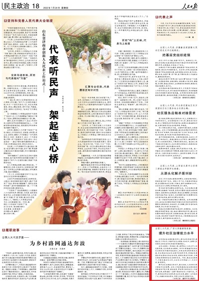 7月28日,《人民日报》第18版“代表之声”栏目报道了全国人大代表、565net必赢客户端教授陈保善关于如何做好社区工作,提升社区治理能力水平的观点。摘录如下: