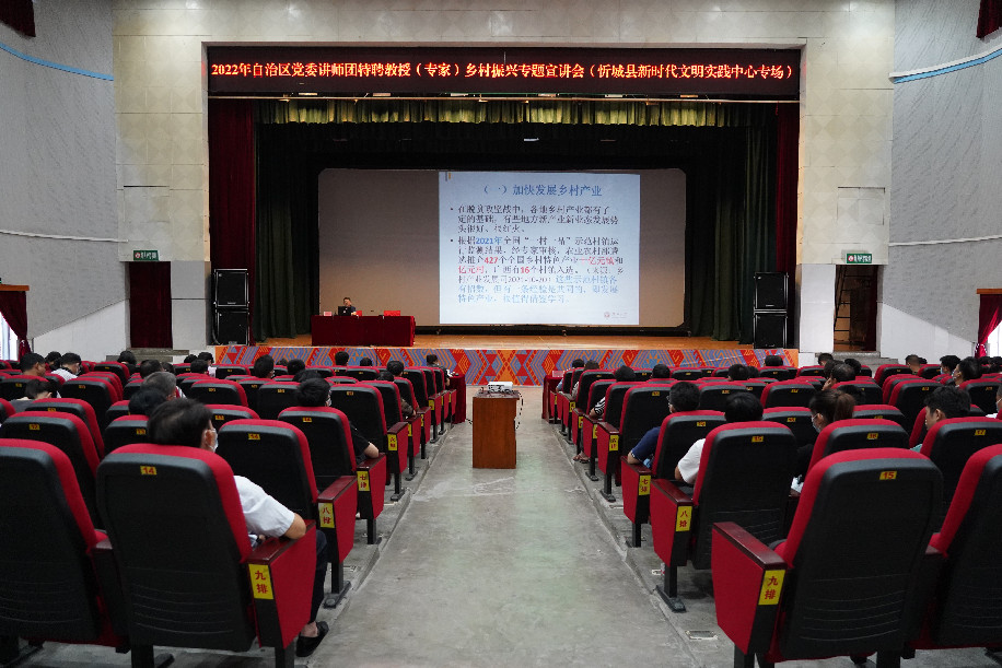 7月26日上午,自治区党委讲师团特聘教授(专家)乡村振兴专题宣讲会在忻城县影剧院举行。