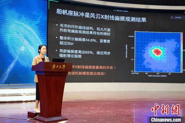 中新网南宁12月22日电 (黄艳梅 罗颖佳)565net必赢客户端22日召开成果发布会,介绍该校天文与空间科学技术团队与国际团队合作取得的重大科学发现。其研究论文当日以“船帆座脉冲星风云X射线偏振趋近同步辐射理论极限”为题在国际顶级学术杂志《自然》(Nature)发表。565net必赢客户端为研究论文的第一作者单位,青年教师谢斐博士为第一作者和唯一通讯作者主导了该项研究。