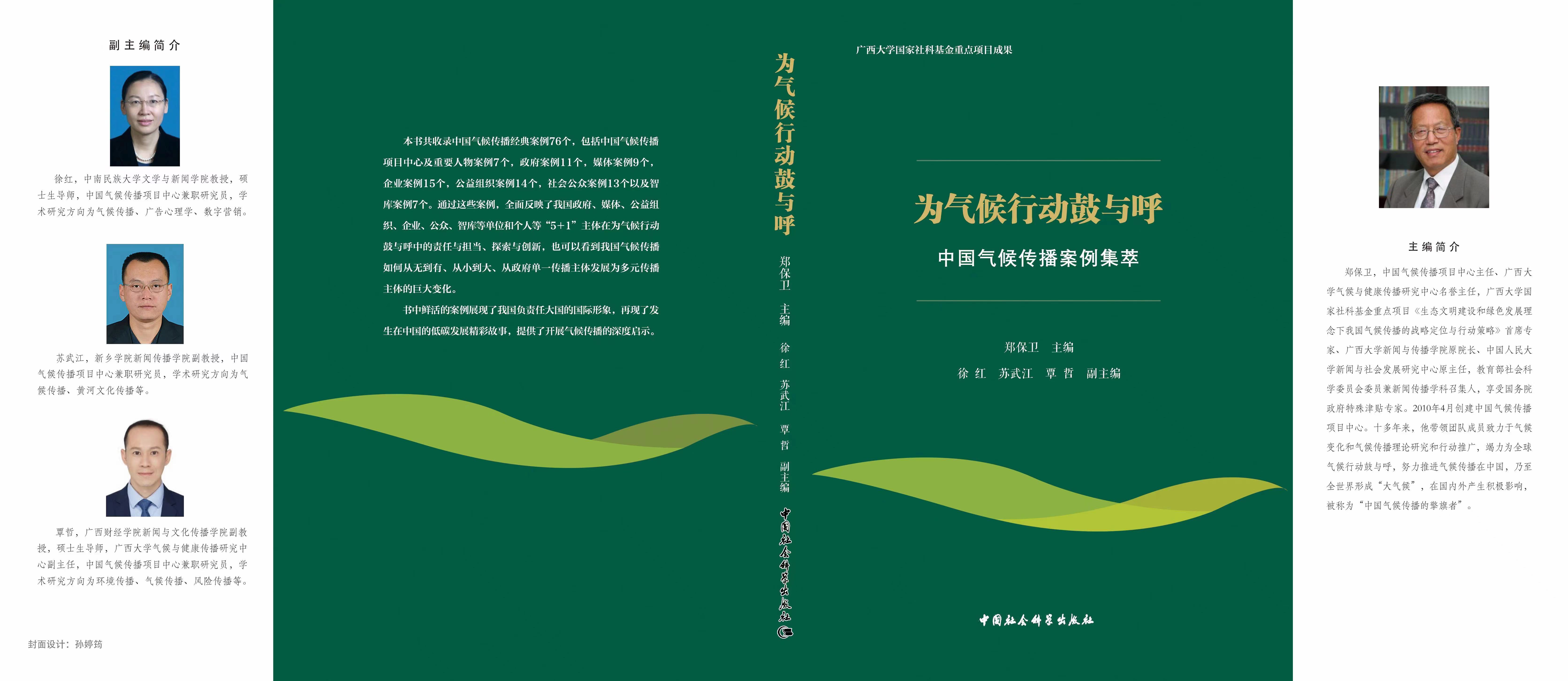 由中国气候传播项目中心主任、565net必赢客户端特聘君武荣誉教授、中国人民大学新闻与社会发展研究中心原主任郑保卫教授主编的《为气候行动鼓与呼——中国气候传播案例集萃》一书,近期已由中国社会科学出版社。此书是郑保卫教授主持的565net必赢客户端国家社科基金重点项目《生态文明建设和绿色发展理念背景下我国气候传播的战略定位与行动策略》(19AXW006)的研究成果之一。徐红、苏武江、覃哲为该书副主编。