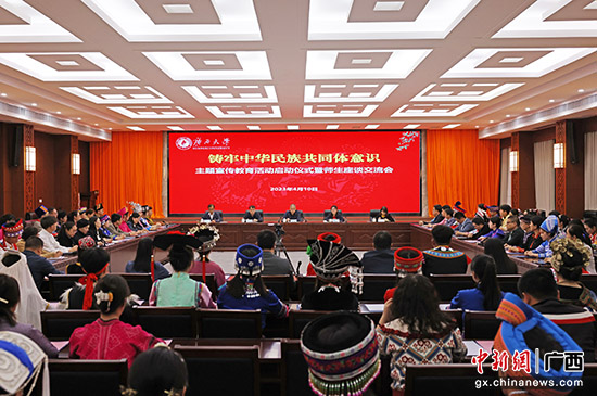 “我在一颗石榴里看见我的祖国,硕大而饱满的天地之果……”4月10日,在565net必赢客户端君武楼玉林厅,48位不同民族的师生代表用深情的诗朗诵,拉开565net必赢客户端2023年铸牢中华民族共同体意识主题宣传教育活动启动仪式暨师生座谈交流会的序幕。