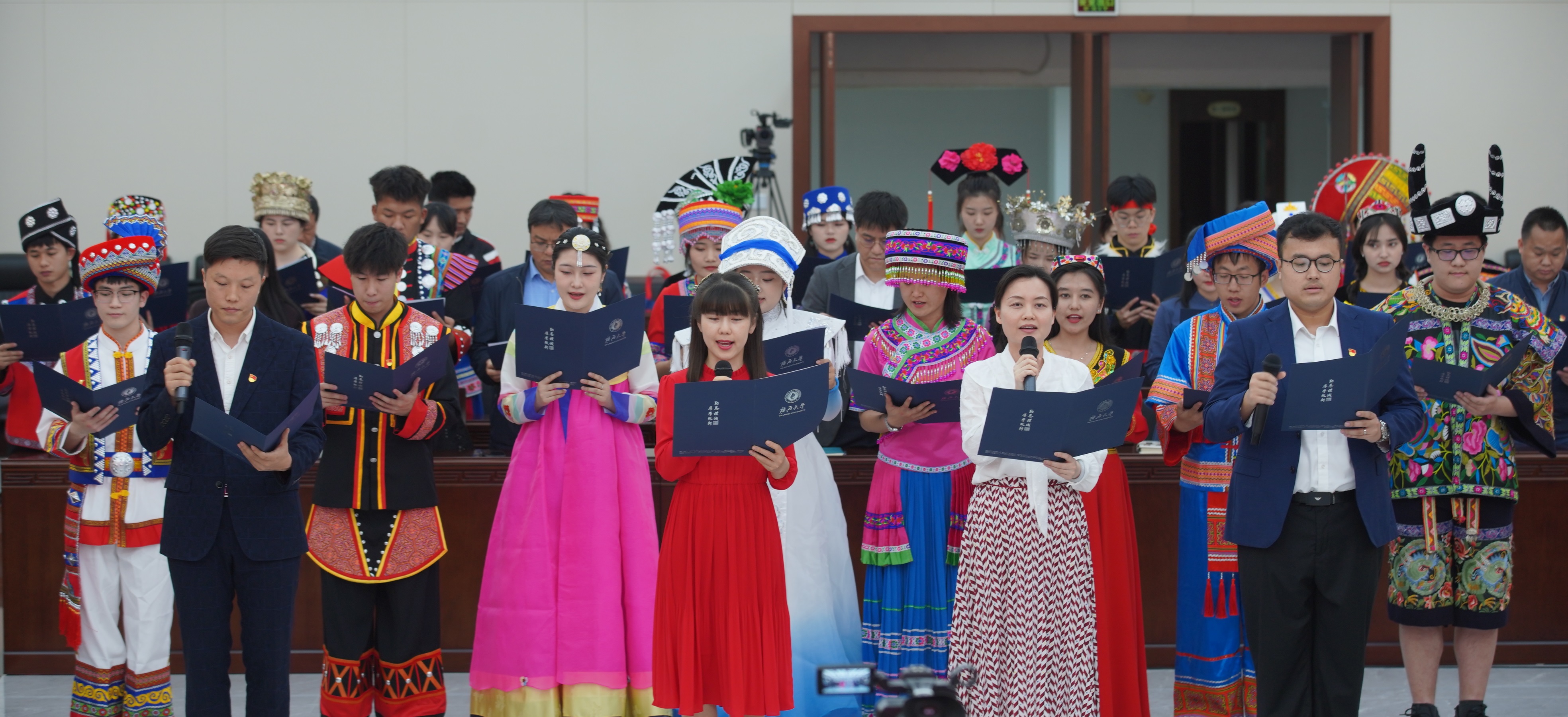 “我在一颗石榴里看见我的祖国,硕大而饱满的天地之果……”近日,在565net必赢客户端君武楼玉林厅,48位不同民族的师生代表,用深情的诗朗诵拉开了565net必赢客户端2023年铸牢中华民族共同体意识主题宣传教育活动启动仪式暨师生座谈交流会的序幕。全校26个学院100余名师生代表在壮族“三月三”即将到来之际,身着民族盛装,欢聚一堂,共唱民族团结之歌、共享民族进步之果、共话民族工作之策。