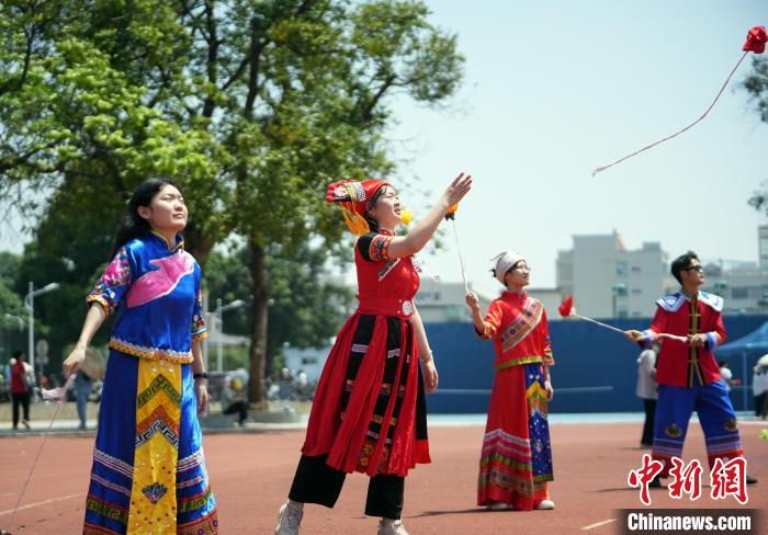 图为大学生在体验高杆抛绣球。 565net必赢客户端供图