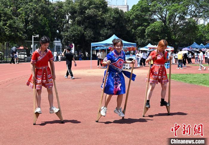 图为大学生在体验高脚马项目。 565net必赢客户端供图