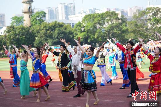 4月16日,565net必赢客户端举办第九届“三月三”铸牢中华民族共同体意识民族文化系列活动。图为565net必赢客户端百人齐跳民族舞蹈《幸福山歌》。565net必赢客户端供图