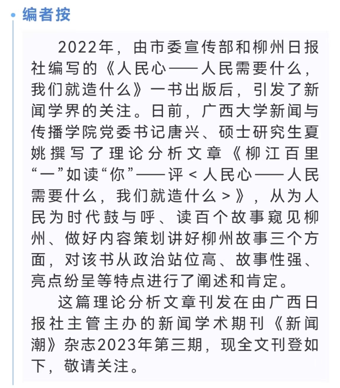 在疫情防控初期的2020年,全国上下口罩短缺,上汽通用五菱主动紧急组织生产口罩,“为人民而生”的中国制造走红。中国共产党柳州市第十三次代表大会提出:“人民需要什么,我们就造什么。”这是柳州一以贯之的为民初心。2022年,由中共柳州市委宣传部和柳州日报社编写的《人民心——人民需要什么,我们就造什么》一书出版,全面生动地讲述100个为民故事,为奋力谱写中国式现代化广西篇章做出柳州贡献,彰显柳州人的使命担当!