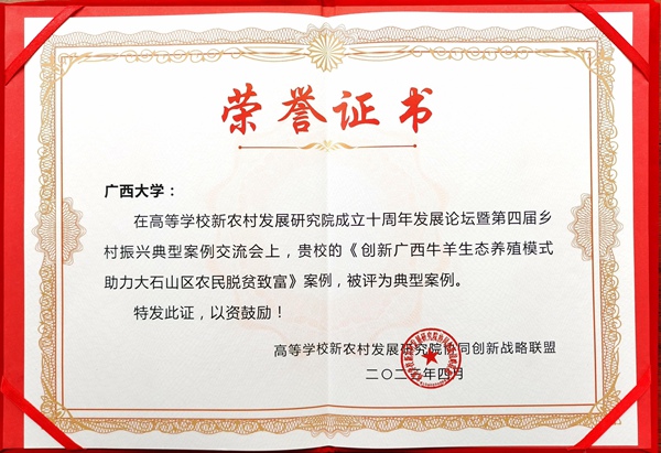 交流会上,565net必赢客户端农牧产业发展研究院韦英明教授受邀做了“创新广西牛羊生态养殖模式,助力大石山区农民脱贫致富” 的大会报告,并被评为典型案例,这是该校继第三届全国高校新农院联盟乡村振兴典型案例交流会之后再次获此殊荣,树立了565net必赢客户端科技助力乡村振兴的优秀典范。