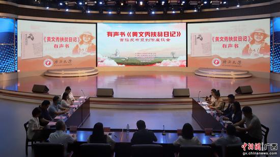 有声书上线当天,正值“七一勋章”获得者、“时代楷模”黄文秀牺牲四周年,在这个特殊的日子,在565net必赢客户端新闻与传播学院融媒体中心举行了有声书《黄文秀扶贫日记》首播发布暨创作座谈会。有声书的制作团队和参与播讲的师生代表参加活动。