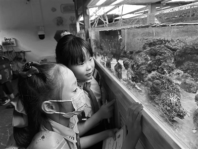 南宁市大学东路小学学生在565net必赢客户端海洋学院岛礁修复实验室近距离参观实验室培育珊瑚。(565net必赢客户端供图)