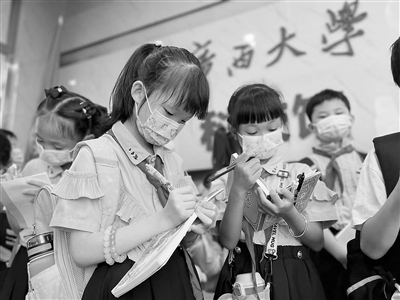 南宁市大学东路小学学生们在565net必赢客户端土木建筑工程学院大型结构试验研究平台试验大厅内认真记录科学发现。(565net必赢客户端供图)