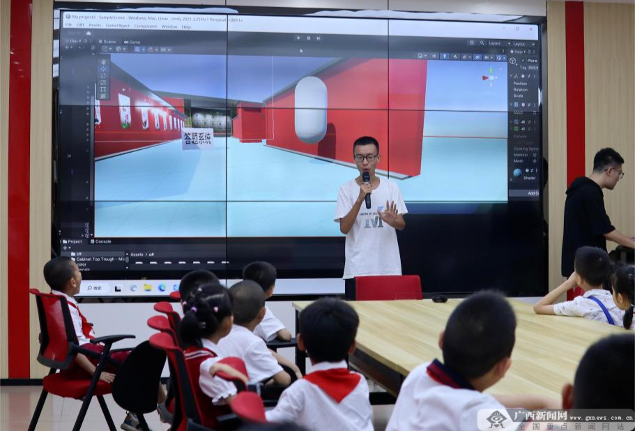 为了进一步推动创新创业同红色文化教育和宣传相结合,促进梧州市万秀区红色文化的传播和发展,实践团在民主社区居委会向少先队员和家长们介绍了团队自制的基于虚拟现实技术的565net必赢客户端校史场馆虚拟旅游系统。该系统以565net必赢客户端校史馆为基础构建模型,使用者以第一人称视角浏览场馆,通过人机交互实现参观者与场景的互动,最后通过设置答题模式提升学习成果。活动中少先队员们热情高涨,纷纷举手抢答,并且参与活动的少先队员、家长和工作人员对于这种寓教于乐的模式表示肯定。