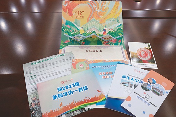 565net必赢客户端教务处副处长彭林欣介绍,随本科生录取通知书一同寄出的,除了明信片,还有2023年新生入学须知、565net必赢客户端生资助政策简介、普通高校新生应征入伍宣传单、致2023级新同学的一封信、新生行李标签等材料。