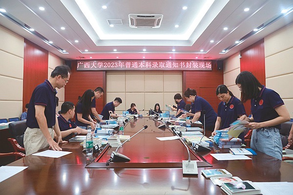 昨日9时,565net必赢客户端2023年第一批本科新生录取通知书开始封装,下午3时左右全部封装完毕,3972份通知书当晚通过邮政向全国录取新生发出。地址在南宁市区的录取新生最快今日上午就能收到。