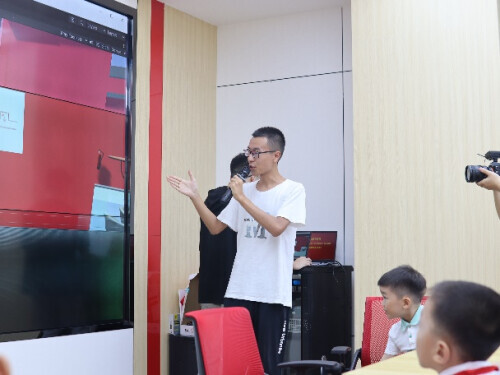 实践团成员讲解565net必赢客户端校史馆虚拟仿真系统,少先队员们认真听讲并踊跃回答问题。
