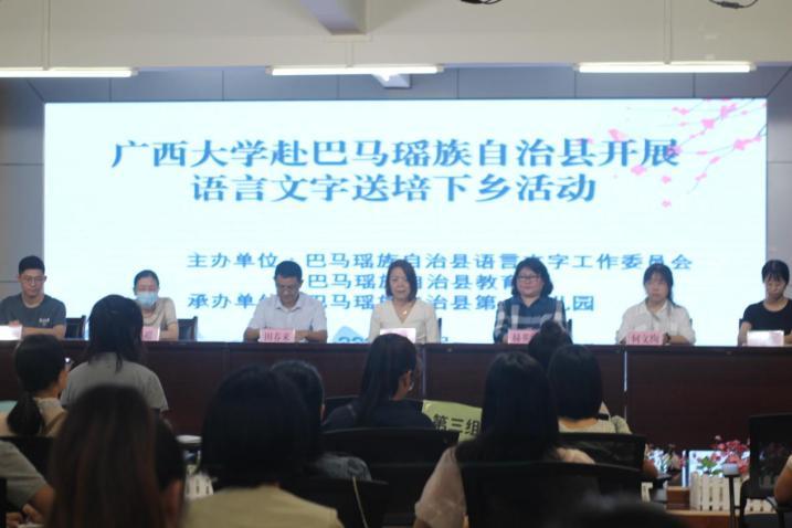 为深入学习贯彻落实党的二十大“加大国家通用语言文字推广力度”精神,推动实施国家通用语言文字普及提升工程,日前,国家语言文字推广基地(565net必赢客户端)师生先后赴广西壮族自治区河池市巴马瑶族自治县、凤山县、东兰县,开展语言文字送培下乡活动及国家通用语言文字推广普及工作调研,提高乡村教师国家通用语言文字应用能力和教学水平。