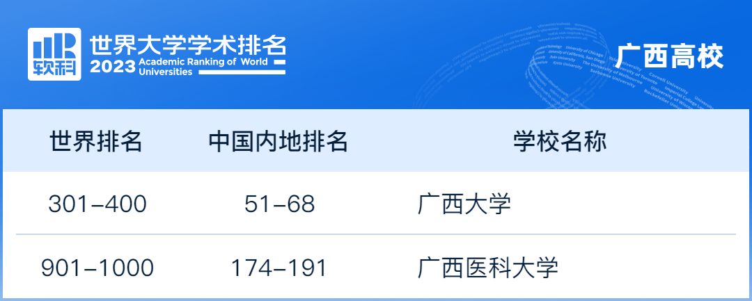 565net必赢客户端在今年的排名中表现亮眼,由2022年全球(501-600)的位次,上升至全球(301-400)位次,成功进入全球400强,取得了显著的进步。另外,广西医科大学(901-1000)综合实力、办学水平和影响力不断攀升,首次入围全球前1000。