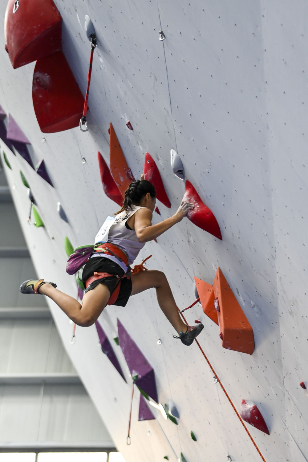 在广西马山县古零镇初级中学攀岩馆,李彦郯在第一届全国学生(青年)运动会攀岩项目难度赛的比赛中。新华社记者 曹祎铭 摄
