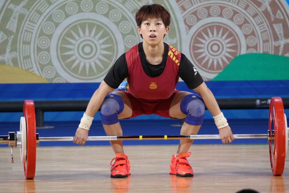 在举重女子45公斤级比赛中,福建选手徐璐莹抓举85公斤平世界纪录。赛事组委会供图