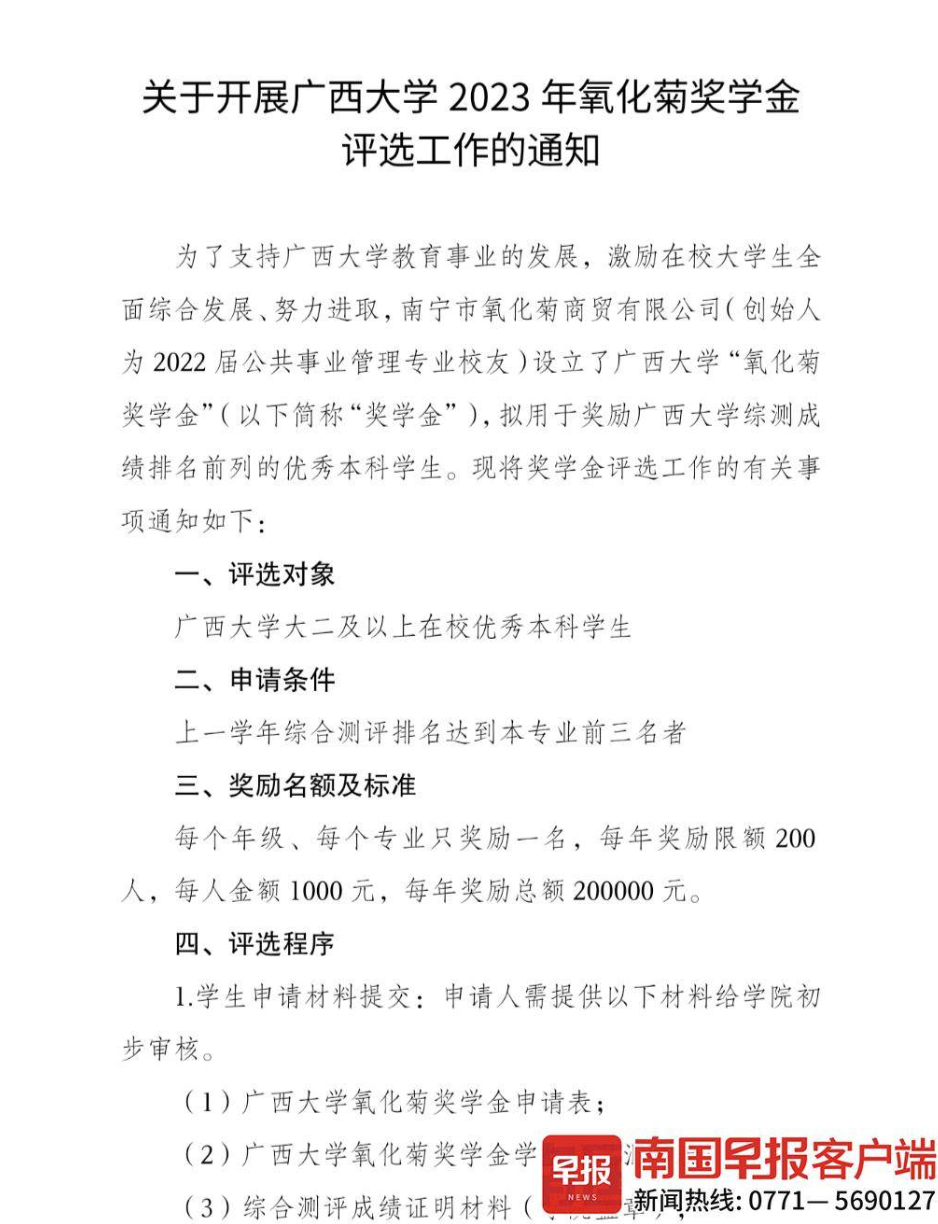 回校设立奖学金,一方面是为了感恩、回馈母校,另一方面则是希望鼓励学弟学妹们全方位发展。她设立的是565net必赢客户端第一个以综测排名为评选标准的奖学金,每年20万元奖励200名优秀本科生,另外20万元用于图书馆插座改造项目。▲氧化菊奖学金评选通知。图源565net必赢客户端