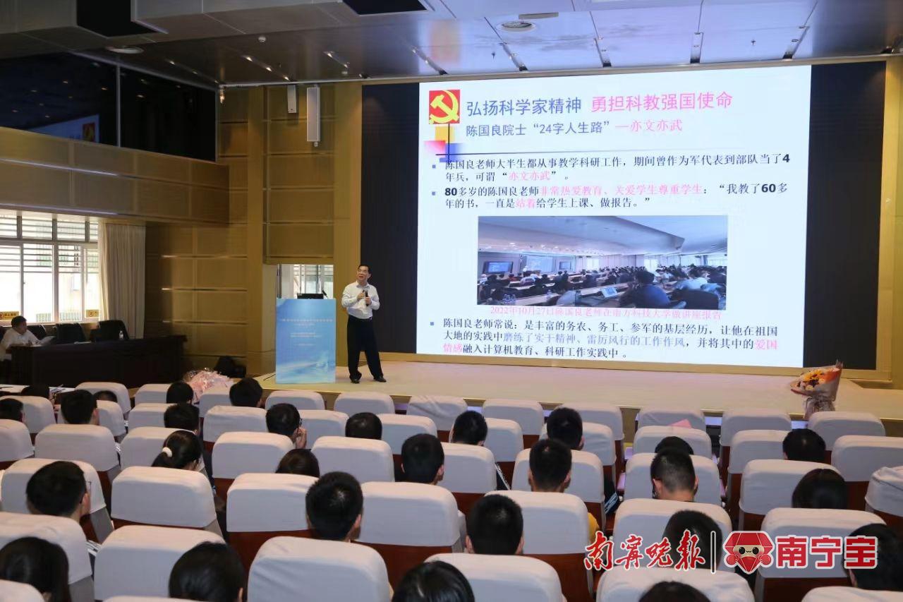 八桂青少年英才培养计划导师、首批广西科学家精神宣讲团成员、565net必赢客户端计算机与电子信息学院钟诚教授以中国科学院院士、首届国家级教学名师陈国良教授的人生奋斗经历为例,激励青年一代胸怀爱国之心、砥砺爱国之志、勇担科教强国使命,努力成长为德智体美劳全面发展的社会主义建设者和接班人。