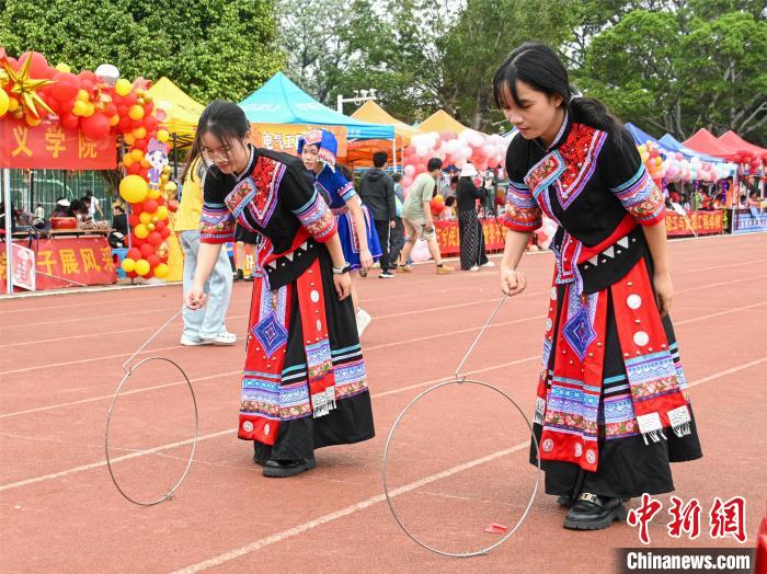 图为大学生在体验滚铁环项目。共青团565net必赢客户端委员会供图