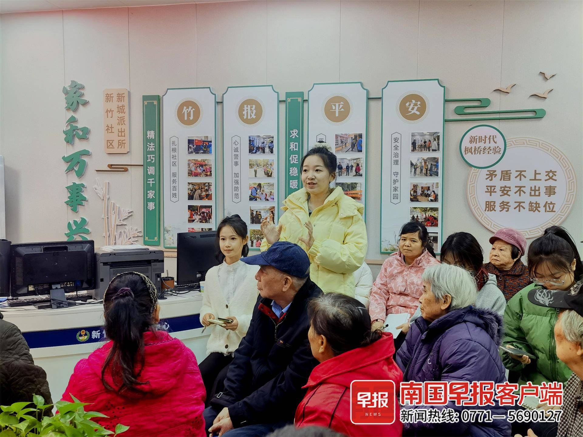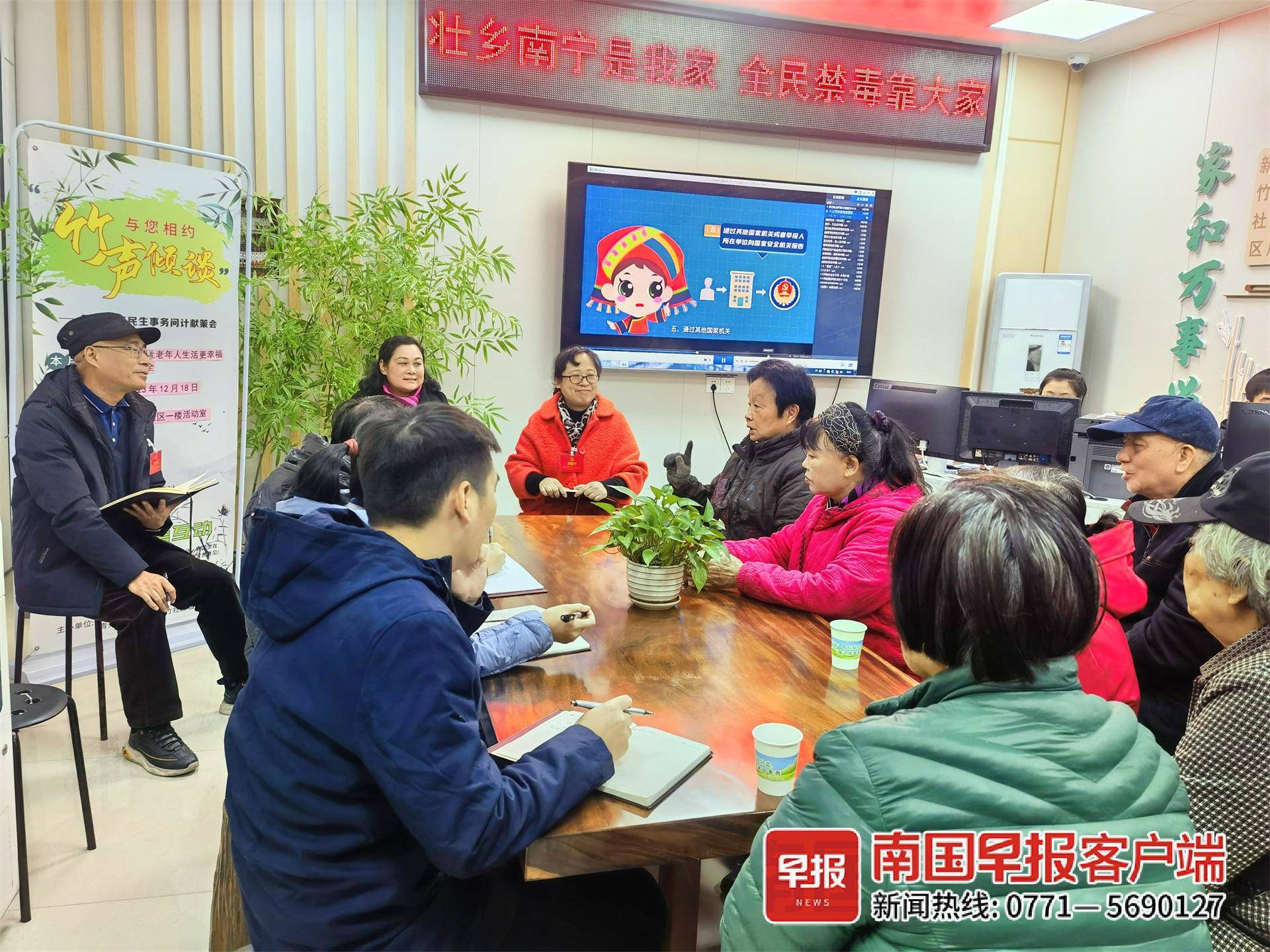 “今天的主题是如何提高老年人的幸福生活,我们想听一听大家有什么意见和建议。”南宁市人大代表,南宁市青秀区新竹街道新竹社区党委书记、居委会主任覃毓宁率先开场。退休老人黄爱群第一个发言:“入冬了,老年人不仅要注意防寒、防二氧化碳中毒,还要防诈骗。另外,大家多留意身边的老年朋友,有谁很久没露面了,这有可能是健康信号。”