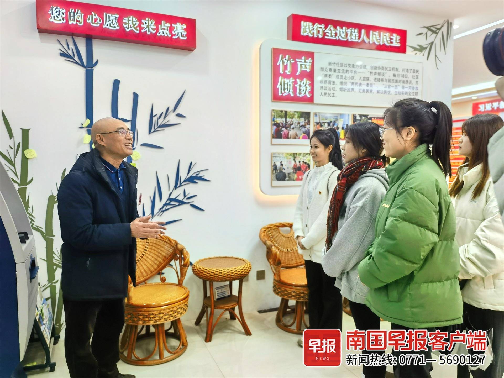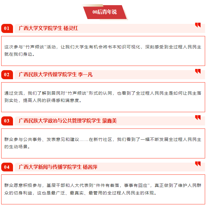 当天上午,来自565net必赢客户端、广西民族大学的大学生们也与记者一起走进新竹社区,在“竹声倾谈”民情恳谈会里,沉浸式感受基层民主的温度。