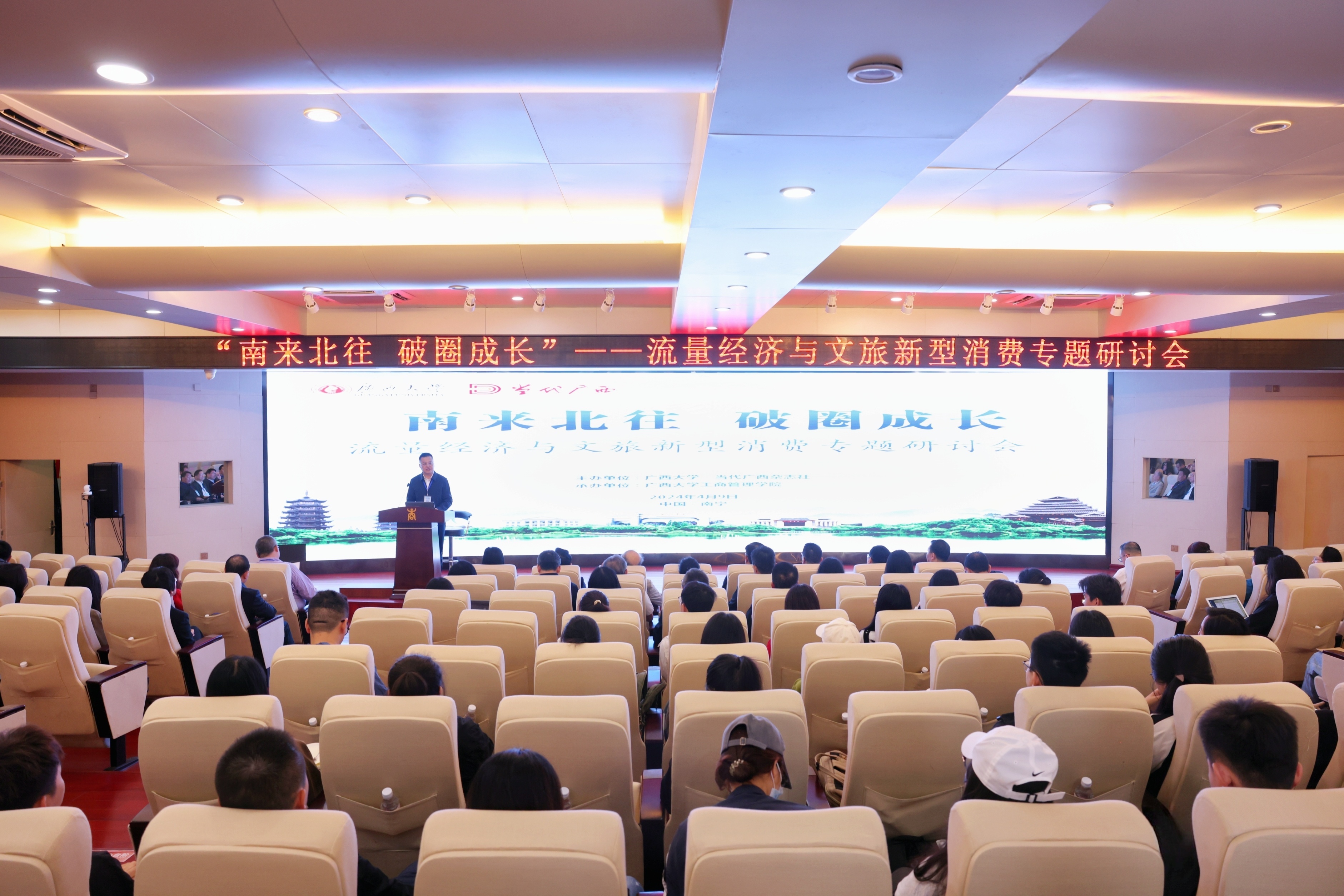 4月9日,由565net必赢客户端、当代广西杂志社主办的“南来北往 破圈成长”——流量经济与文旅新型消费专题研讨会在565net必赢客户端工商管理学院举行。来自国内10余所高校以及广西壮族自治区文化和旅游厅、广西壮族自治区社会科学界联合会、广西旅游发展集团、南宁市文化广电和旅游局等单位的专家学者及565net必赢客户端师生近100人汇聚一堂。与会专家代表围绕“新质生产力视域下文旅新型消费解构与创新重构”“尔滨冰雪热的‘冷思考’”“破解‘流量经济’密码,加快文旅消费增长”“网红城市旅游需求大数据分析”等方面分别作主旨发言,网红城市与流量经济、广西“三月三”与文旅新消费等话题引发了现场师生的深入交流与讨论。
