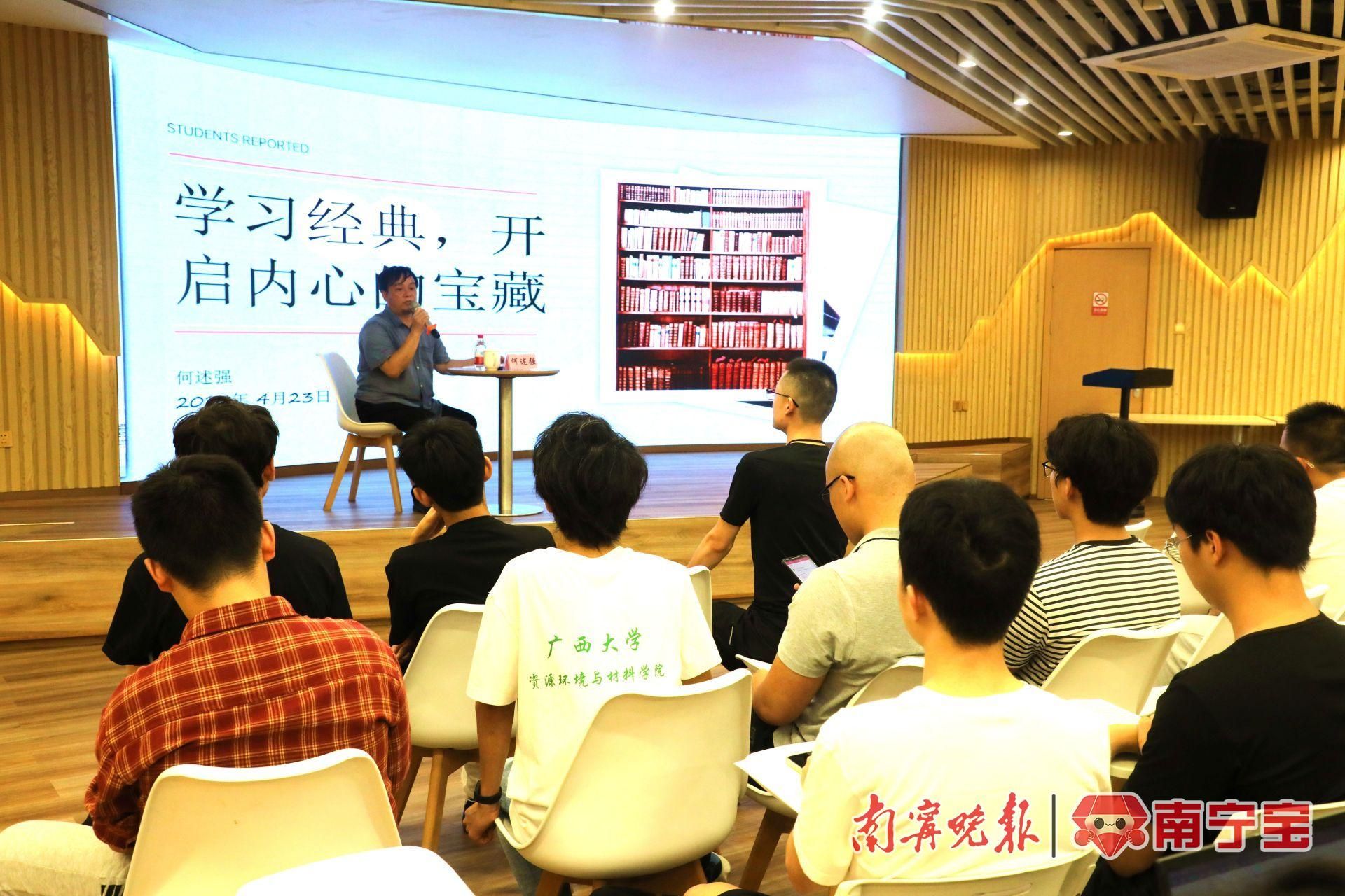 何述强还给读者们讲述了如何读鲁迅的经历。他从小学开始读,一直读到大学,大学毕业以后又借了《鲁迅全集》继续读。“当时我在罗城高中当老师,我在校园的围墙外面松树下又把《鲁迅全集》给读了。因此,读一部经典需要时间,需要锲而不舍的、长期的对这部经典保持着极大的兴趣,同时不畏惧任何困难。”