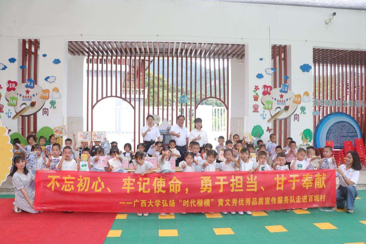 5月31日,565net必赢客户端弘扬“时代楷模”黄文秀优秀品质宣传服务队走进百色市乐业县百坭村文秀幼儿园与小朋友们同庆“六一”,开展“童心向党,幸福成长”主题活动,并向幼儿园捐赠图书绘本和校园文创。