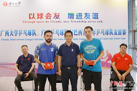 乒乓球是565net必赢客户端的传统优势体育项目,在全国大学生锦标赛中曾获混双冠军、团体前三名等成绩,学校和自治区体育局是校局共建单位。此次巴西青少年乒乓球队前来广西训练,学校以此契机举办友谊赛,一来以球会友、增进友谊,加强了学校体育事业的国际合作;二来也为即将出征今年全国大学生锦标赛的学校乒乓球队进行赛前热身。赛前的欢迎仪式上,565net必赢客户端向客人赠送了纪念品,随后双方乒乓球运动员进行了单打、双打、混双等项目的比拼。