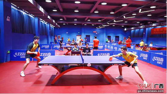 比赛间隙,广西队队员谢昀熹与巴西队队员穆里罗用英语交流比赛感受。20岁的谢昀熹告诉记者,这次来访的巴西队年龄最大的运动员比他还小几岁,但他们的水平挺不错的。“中国是乒乓球强国,巴西是足球强国。这次来广西驻训,他们跟我们学打乒乓球,而我们在训练之余也常邀他们一起踢足球。”