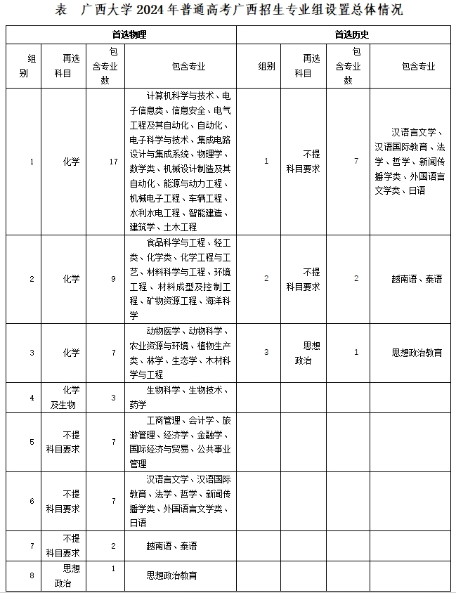 根据广西壮族自治区招生考试院招生计划及志愿填报设置办法,依据“吸引高分、减少调剂、确保生源”的原则,必赢2024年本科招生专业组总体设置方案如下:67个招生专业中,特殊类型招生(艺术、体育类)按自治区招生考试院要求单独设置院校专业组;普通类招生以首选科目不同,分别设置历史、物理两大院校专业组,然后根据再选科目、生源情况、学科类型等因素在同一首选科目下设多个招生专业组,其中首选科目为历史的专业设三个组,首选科目为物理的专业设八个组。
