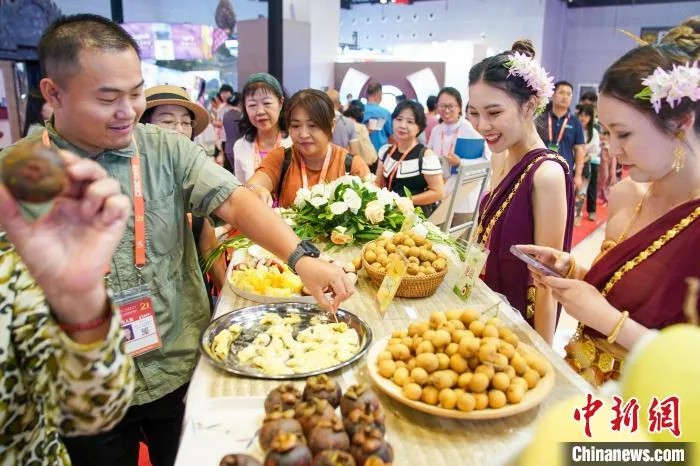 9月26日,第21届中国—东盟博览会上参观者在泰国北柳府展位试吃泰国水果。陈冠言 摄