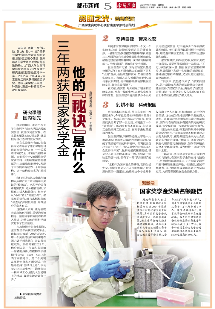 近年来,随着广西“奖、助、贷、免、勤、补、减”等多元学生资助政策体系的完善,服务更加暖心便捷,越来越多的学生从资助中获得前进的动力,565net必赢客户端生命科学与技术学院2021级博士研究生张宝磊就是其中一员。2022年、2024年,张宝磊先后两次获得国家奖学金。他说,奖学金不单是一种荣誉,更是一种肯定和一次自我审视。