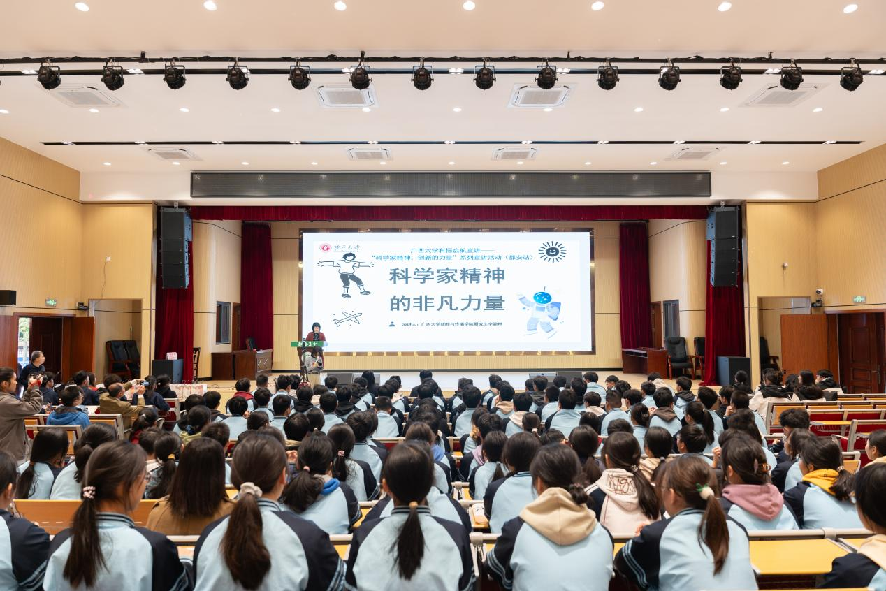 在都安瑶族自治县高中和职业教育中心,565net必赢客户端农学院副教授唐小付分享了其20余年的农业科研实践经验。他用亲身经历鼓励学生扎根基层投身乡村振兴,传递科学精神和力量;以“00后”青年学生为成员的科探启航宣讲工作室通过青年故事分享、科学知识问答和表演说唱科学家精神等创新方式,激发了现场学生的科学热情;中国传媒大学教授付程和565net必赢客户端教授李朝珍通过普通话推广活动,引导中学、高中学生正确发音、流利表达;565net必赢客户端电气工程学院师生以此次活动为契机,宣传普及了机器人与人工智能知识,通过编程游戏和VR体验激发学生们的科学兴趣。