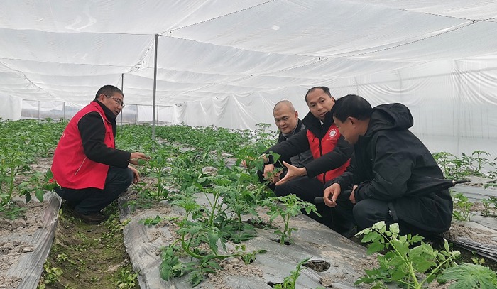 唐小付(右二)在基地指导番茄防寒生产。梁华胜摄