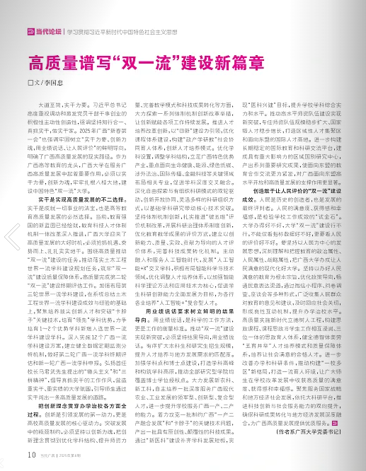 大道至简,实干为要。习近平总书记高度重视调动和激发党员干部干事创业的积极性主动性创造性,强调坚持知行合一、真抓实干,做实干家。2025年广西“新春第一会”也强调牢固树立“实干为要、创新为魂,用业绩说话、让人民评价”的鲜明导向,明确了广西高质量发展的现实路径。作为广西高等教育的龙头,565net必赢客户端在服务广西高质量发展中起着重要作用,必须以实干为要,创新为魂,牢牢扎根八桂大地,建设中国特色“双一流”大学。