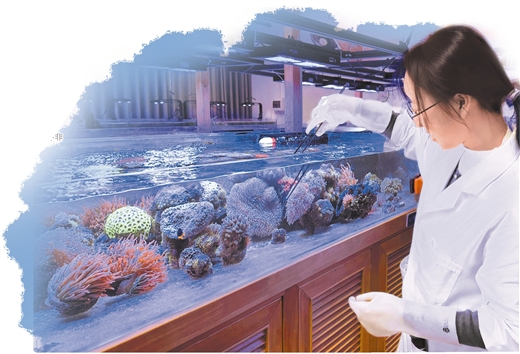 科研人员在岛礁生态修复实验室中呵护珊瑚成长。