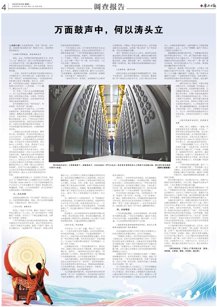 当前,广西成立由自治区党政主要领导为组长的人工智能发展工作专班,实施中国工程院战略咨询项目《面向东盟的广西人工智能应用战略研究》,优化顶层规划设计。政府部门、高校、企业等纷纷开始行动,布局“人工智能+”。自治区工信厅提出,力争到2027年形成100个标志性智能产品,打造100个人工智能典型应用场景;自治区科技厅聚焦林业、糖业、工程机械、有色金属、交通物流、口岸贸易等,启动一批人工智能行业垂直领域应用研发项目,力争培育2—3个有全国竞争力的行业大模型;并实施赋能行动,聚焦典型应用场景,支持一批大模型示范应用项目。
