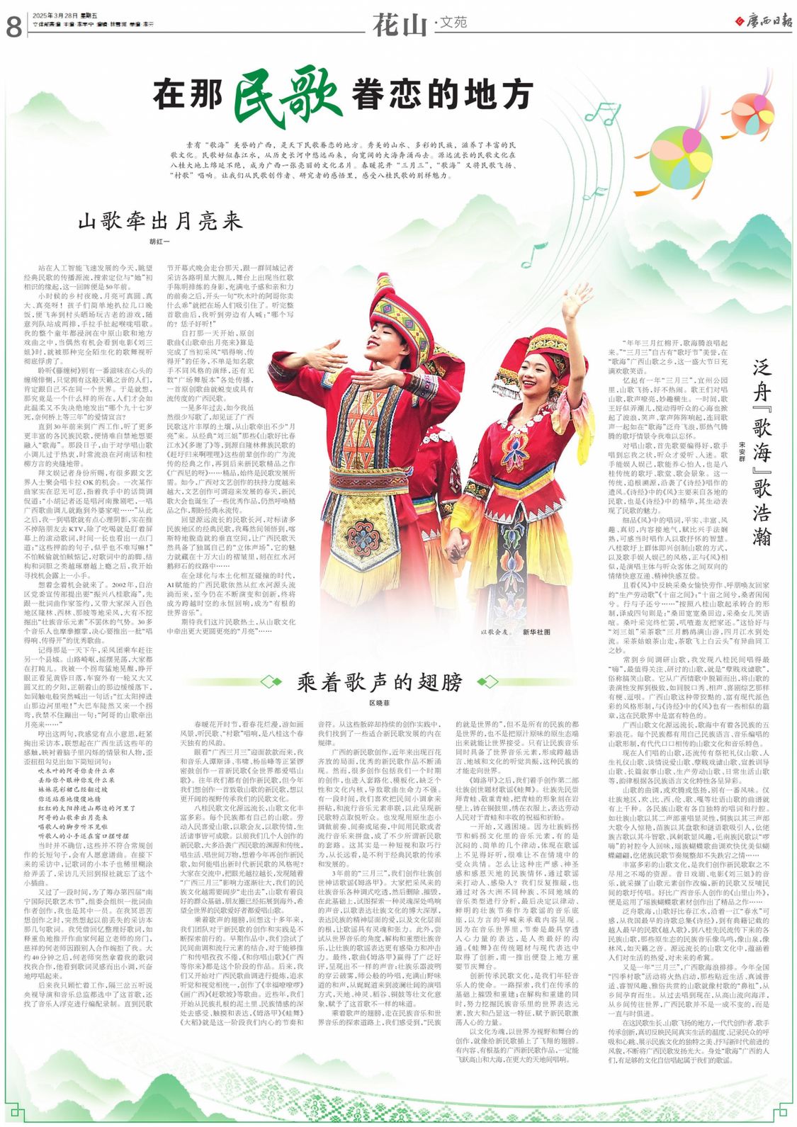 素有“歌海”美誉的广西,是天下民歌眷恋的地方。秀美的山水、多彩的民族,滋养了丰富的民歌文化。民歌好似春江水,从历史长河中悠远而来,向宽阔的大海奔涌而去。源远流长的民歌文化在八桂大地上绵延不绝,成为广西一张亮丽的文化名片。春暖花开“三月三”,“歌海”又将民歌飞扬、“村歌”唱响。让我们从民歌创作者、研究者的感悟里,感受八桂民歌的别样魅力。
