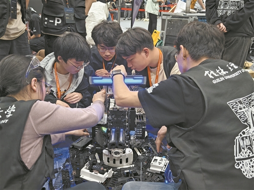 赛前,桂林理工大学群星战队队员在一起检查机器人。