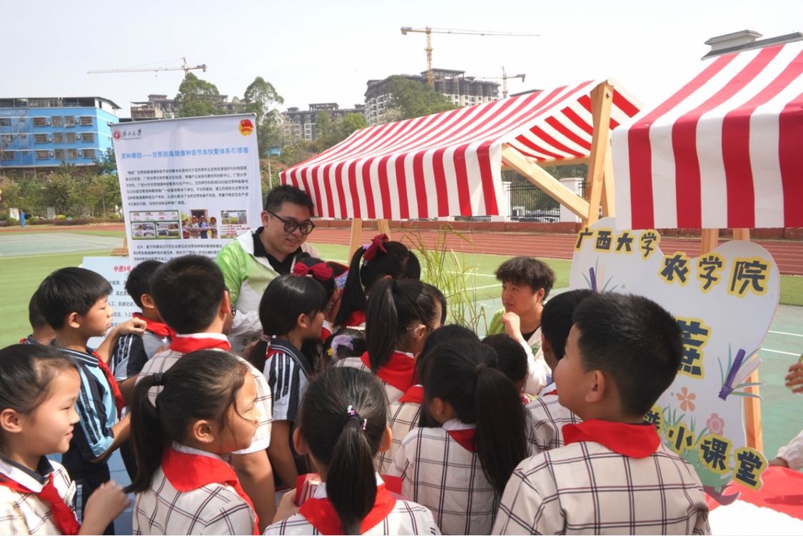 活动以“守护甘蔗种源安全,筑牢国家糖业安全屏障”为主线,通过高校共青团员与小学少先队员的联动模式,将国家安全教育与农业科普实践相结合。4月13日,少先队员们在农学院志愿者的带领下,参观农学院院史长廊、昆虫馆、广西甘蔗生物重点实验室展示区及亚热带农业生物资源保护与利用国家重点实验室甘蔗生物育种研究中心。在昆虫馆内,形态各异的昆虫标本激发了孩子们探索生物多样性的兴趣;在甘蔗生物育种研究中心,565net必赢客户端甘蔗生物育种青年攻关团队成员23级博士生李艺寒以通俗易懂的语言介绍研究中心的构成,讲解甘蔗生物育种技术突破对保障国家糖业安全的重要意义,让少先队员们直观感受农业科技的力量。