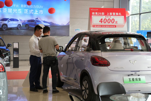 五菱汽车南宁远勋店,销售顾问向客户介绍车辆各项性能特点以及金融支持方案。 广西云-广西日报记者 冼妍杏/摄